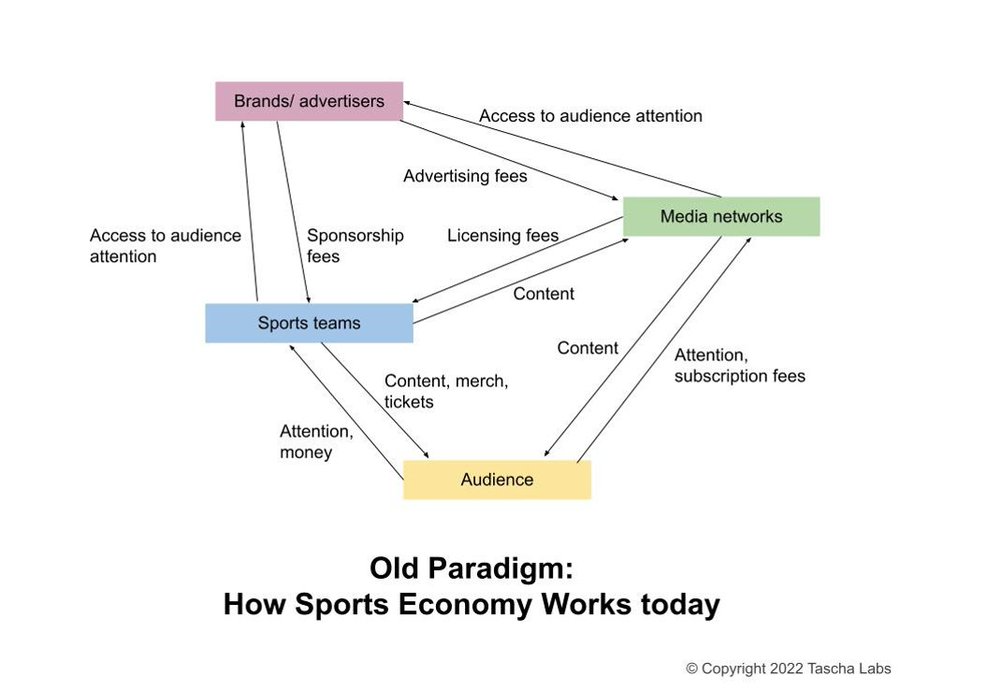 换句话说,体育向媒体网络出售内容权利,然后再出售广告。媒体平台是球队(即体育内容创作者)和品牌(即广告商)的中间人。