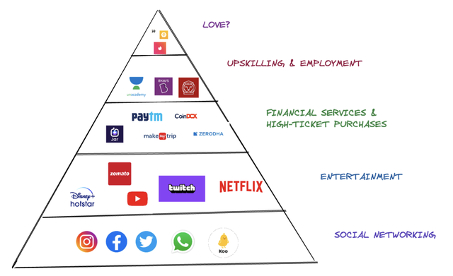 消费模式几乎在非常宽松的意义上遵循马斯洛夫的需求层次结构。在这种情况下,人们从满足他们的基本需求开始,也就是一个可以花费他们注意力的地方。然后,沿着弧线往上走,走向交易和储蓄这样的金融服务。还有一小部分向教育或提高技能的方向发展。我试着根据上述数据,在互联网上做了一个马斯洛夫的需求层次结构。