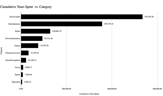 在我看来,数字资产的用户增长弧线将遵循一个非常类似于我们在印度见证的数字消费的模式。上面的数据揭示了印度人在某一年花了多少年的时间来消费不同的应用程序类别。The power law是不言自明的。鉴于社交媒体和娱乐是被动的应用程序,不需要使多大力气 , 他们自然而然的就找到了最多的用户。