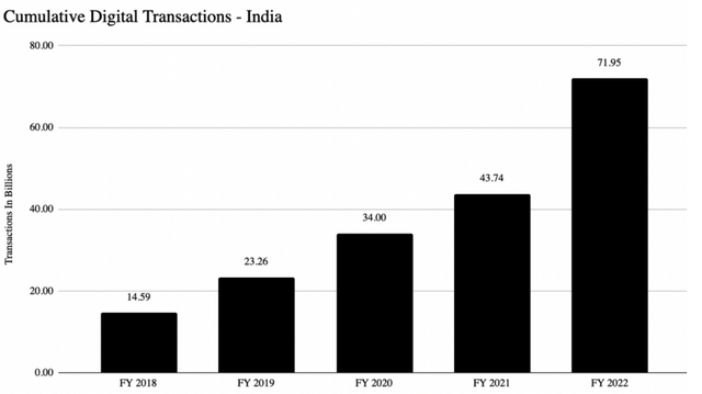 数字银行颠覆了单位经济的包容性。突然间,银行不再需要在世界的偏远地区设立柜台了。相反,他们可以通过移动设备的连接,接触到他们的用户,进行必要的KYC后提供银行服务。这方面的奇迹在印度表现得最为明显。该地区一个名为UPI的国有支付网络,在四年内从每月40亿美元的交易量扩展到每月超过1200亿美元的交易量。印度人每年通过数字方式进行720亿次交易。