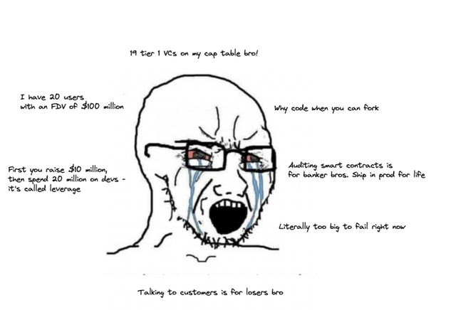 熊市是思考从事加密货币的机会成本的好时机。在一个昼夜不停的行业中工作是有社会、精神和身体成本的。由于代币的工作方式,区块链生态系统中的 “成功 “创始人的定义与过去传统世界中的定义略有不同。可以经常看到没有产品、用户或商业模式的创始人为他们自己和他们的投资者赚取令人难以置信的资金——也就是完全基于炒作的成功。