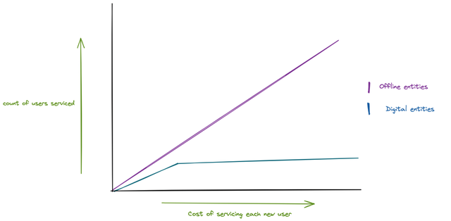 传统上,对于一个贷款人来说,向一万个用户发放贷款,这意味着按比例雇用信用评估人员。比如说1:100,假设信用评估员的效率高得惊人。当数字银行出现时,AML/KYC和分销功能呈指数级增长,减少了花费在上面的时间,使数字平台可以用较小的团队进行扩展。随着用户群的扩大,为每个新用户提供服务所产生的成本也会减少。