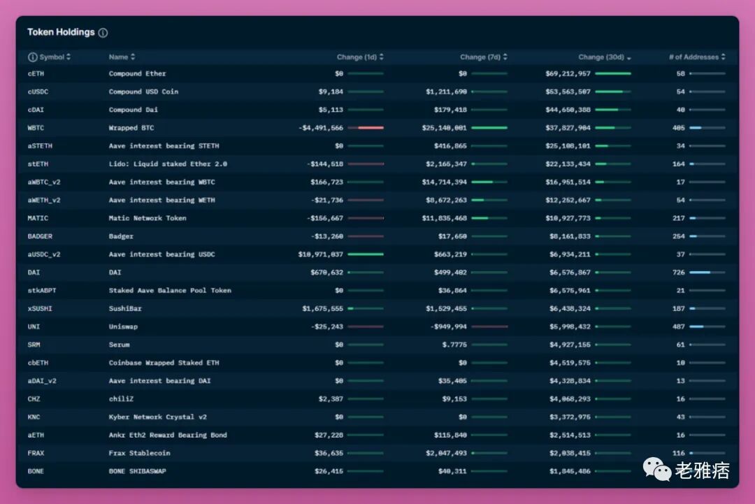 在过去的30天内,我们观察到Smart money正在将资金转移到Compound、Aave和wBTC。他们还积累了MATIC、UNI、SRM、CHZ、KNC和Shiba Inu的BONE(期待Shiba的L2发行)。