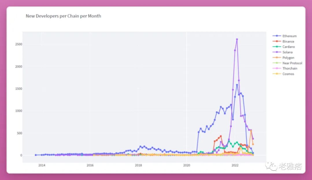 有趣的是,在过去的一个月里,加入Solana和Polygon生态系统的开发者比加入以太坊的要更多。
