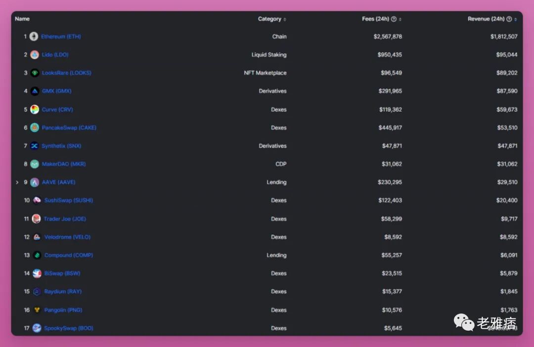 例如,Lido在过去24小时内产生了950,435美元,但其中只有10%(95,044美元)分配给了代币持有人或国库。