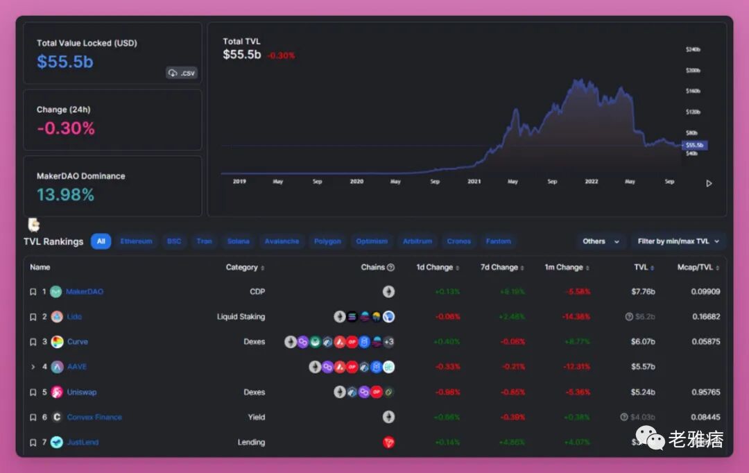 注意:DefiLlama上的TVL计算不包括协议中质押的治理代币、所谓的Pool2 LP代币、借贷市场上的借贷资产、流动性质押资产以及来自其他协议的重复计算TVL。