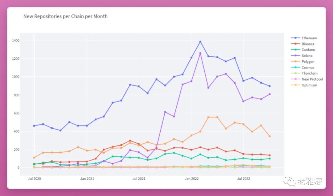 根据对87116个Repositories和98960名开发人员的跟踪数据,以太坊和Solana的活跃度最高,Polygon位居第三。