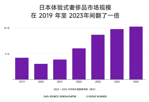 富有创意的零售故事是品牌瞄准日本消费者的关键手段。根据欧睿国际的数据,该国的体验式奢侈品市场规模从 2019 年的 4230 万美元飙升至 2023 年的 8710 万美元,在 2026 年或将达到 1.03 亿美元。