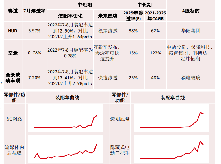 基于渗透率成长速度及ASP两要素,推荐空悬、HUD及全景玻璃车顶;从中短期视角看,空悬仍待观察后续新车发布情况及装配空悬的新车型的销售情况,全景玻璃车顶及HUD装配率快速提升、有望进一步渗透。此外,基于装配率指标,我们观察了45个零部件/功能的上车情况,针对较低装配率且装配率保持上升趋势的零部件/功能,我们认为5G网络、透明底盘从0到1、开始快速上车,流媒体内后视镜及隐藏式电动门把手装配率边际增长迅速,相关赛道具有渗透率快速提升可能。 ☟☟☟ 基本面量化之数据仓库系列:汽车零部件赛道观察与挖掘(2022年8月),建议关注5G网络、透明底盘、流媒体内后视镜、隐藏式电动门把手-20220919-中信证券-30页.pdf-size1.10MB