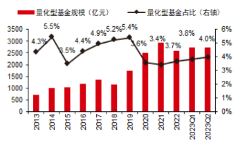 截至 2023Q2,公募量化基金整体规模 2732亿元,在权益型基金占比小幅上升;私募量化基金规模约 1.57 万亿元 ,行业占比约 27%。未来伴随量化策略体系的多元化和成熟度的提高,预计在财富配置中的重要性将进一步提升。 量化基金专题研究系列之十九:2023上半年量化基金跟踪与展望,财富配置中的重要性提升-中信证券.pdf-size1.88MB