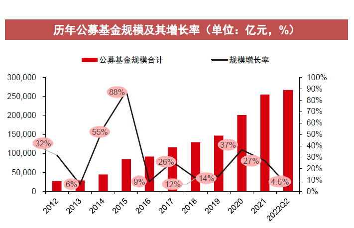 公募基金管理规模环比上升6.7%,至26.7万亿元,规模和份额进一步扩容。截至2022年二季度末,剔除ETF联接基金后,国内公募基金管理规模和管理份额分别达到26.7万亿元和23.8万亿份,均创出了历史新高;管理规模较一季度末增加了16861.8亿元,环比增幅6.7%,较年初增长了4.6%;份额较年初增加了10903亿份,环比增幅4.8%,较年初增长了9.3%。二季度受权益市场回暖的影响,规模增速高于份额的增长。 ☟☟☟ 2022年上半年公募基金盘点与展望:规模再创新高,固收贡献主要增量-20220816-中信证券-42页.pdf-size0.83MB