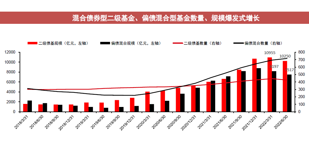 2020年以来的“固收+”概念热潮中,二级债基与偏债混合型基金实现了爆发式增长: 截至2022年二季度末,混合债券型二级基金总规模为10250亿元,总数量为426只;偏债混合型基金总规模为7517亿元,总数量为717只。二级债基与偏债混合型基金的合并规模超1.7万亿元,合并数量达1143只,相对2019年末的3994亿元、547只增长迅速。考虑到混合债券型一级基金、灵活配置型基金分类中亦有部分以“固收+”策略运作的产品,我们判断实际的公募“固收+”基金数量、规模将高于上述水平。 ☟☟☟ 基金组合专题系列:固收+基金池筛选和组合构建-20220815-中信证券-31页.pdf-size1.46MB