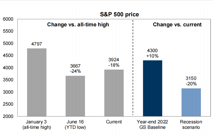 高盛股市预测:标准普尔500指数截至2022年将报4300点(无衰退),而非3150点(衰退情景);美国股市情景:标准普尔500指数截至2022年将报4300点(无衰退),而非3150点(衰退情景);股票的绝对估值和相对估值:标准普尔500指数的市盈率从1月份的21倍压缩到今天的17倍,压缩了27倍。 ☟☟☟ 高Where to Invest Now_ Equities Will Survive Another 75(1).pdf-size3.22MB