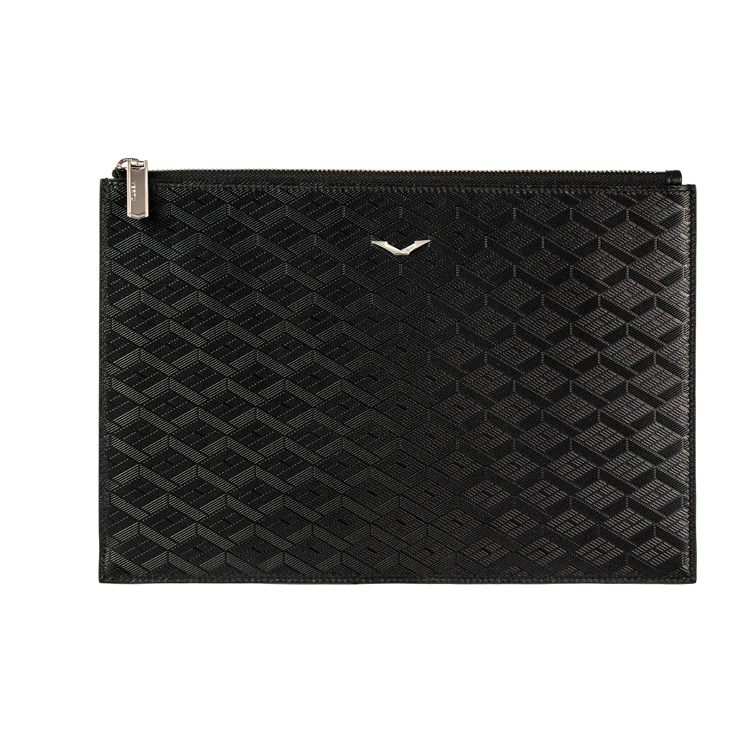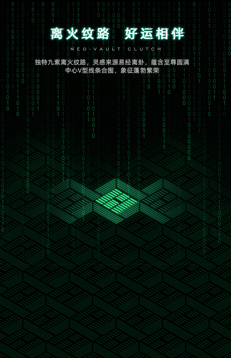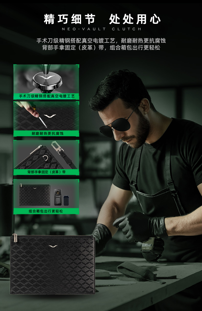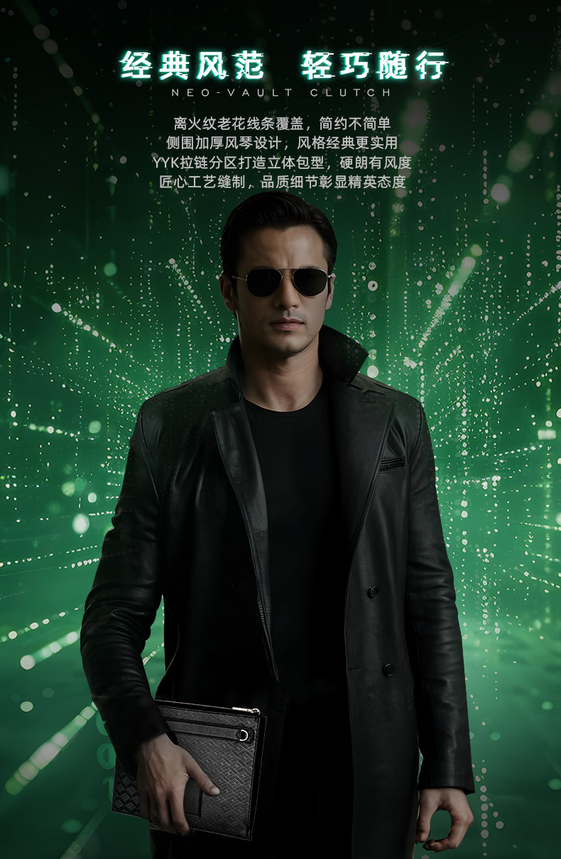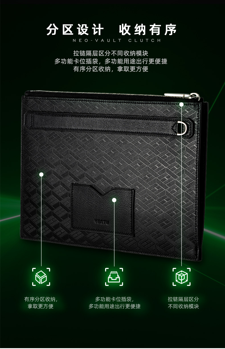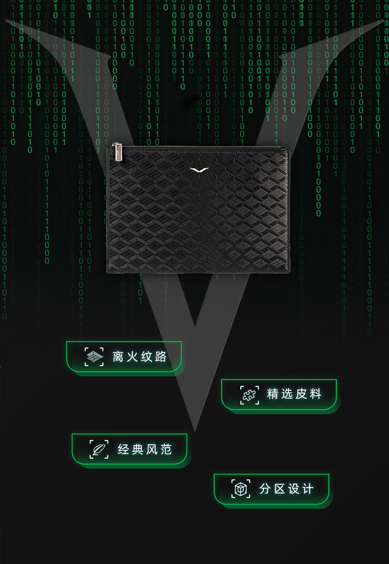 2024秋夏“超体”皮具系列,以离卦火纹图案与品牌“V”形logo的完美结合,打造出独一无二的九紫离火纹,寓意着新的开始、希望与繁荣。“超体”系列——手拿包,采用离火纹老花线条覆盖,简约不简单侧围加厚风琴设计;风格经典更实用YYK拉链分区打造立体包型,硬朗有风度匠心工艺缝制,品质细节彰显精英态度。