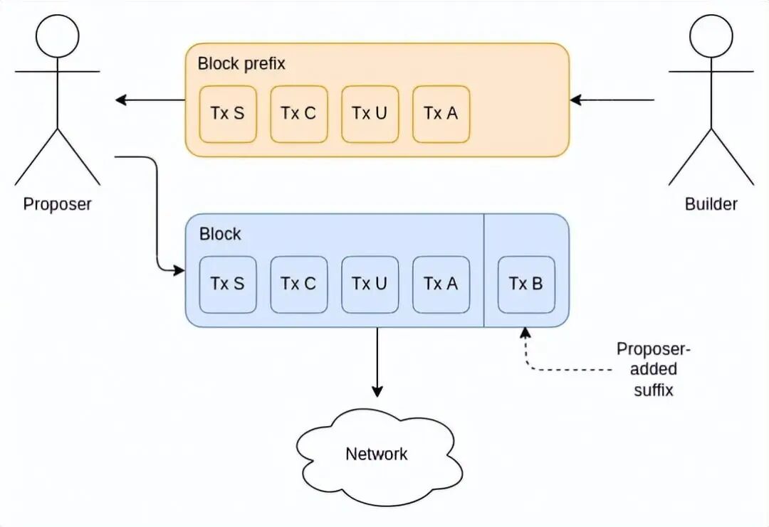 另一种构造是允许提议者为区块创建一个后缀。构建者在构建区块时不会看到关于提议者意图的信息,而提议者能够将构建者遗漏的任何交易添加到末端。
