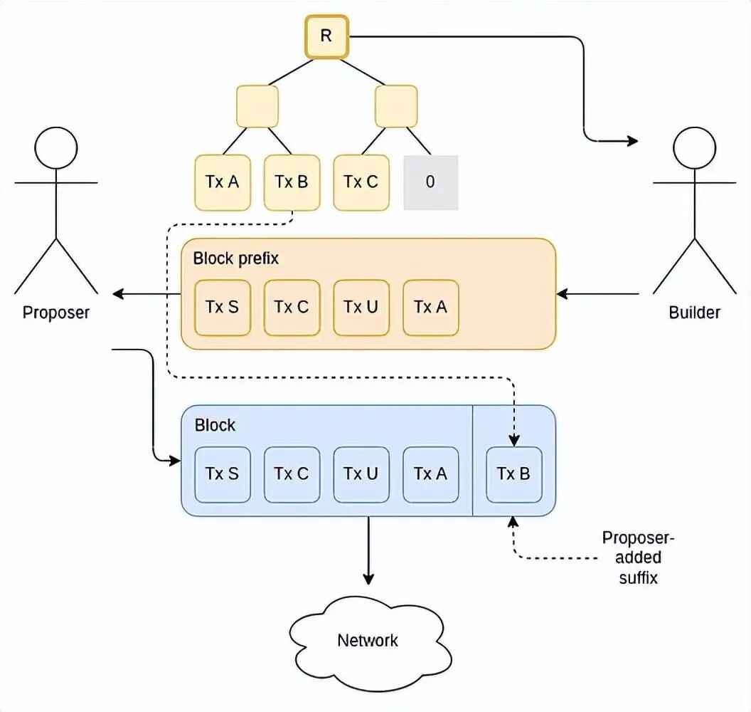 另一种构造是允许提议者为区块创建一个后缀。构建者在构建区块时不会看到关于提议者意图的信息,而提议者能够将构建者遗漏的任何交易添加到末端。