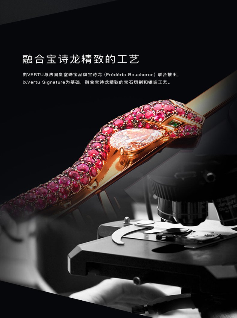 当VERTU遇上宝诗龙,会碰撞出怎样的火花?VERTU SIGNATURE眼镜蛇全球限量版给出了答案。这款手机以VERTU Signature为基础,融入了宝诗龙精湛的宝石切割和镶嵌工艺,将奢华与精致发挥到了极致。