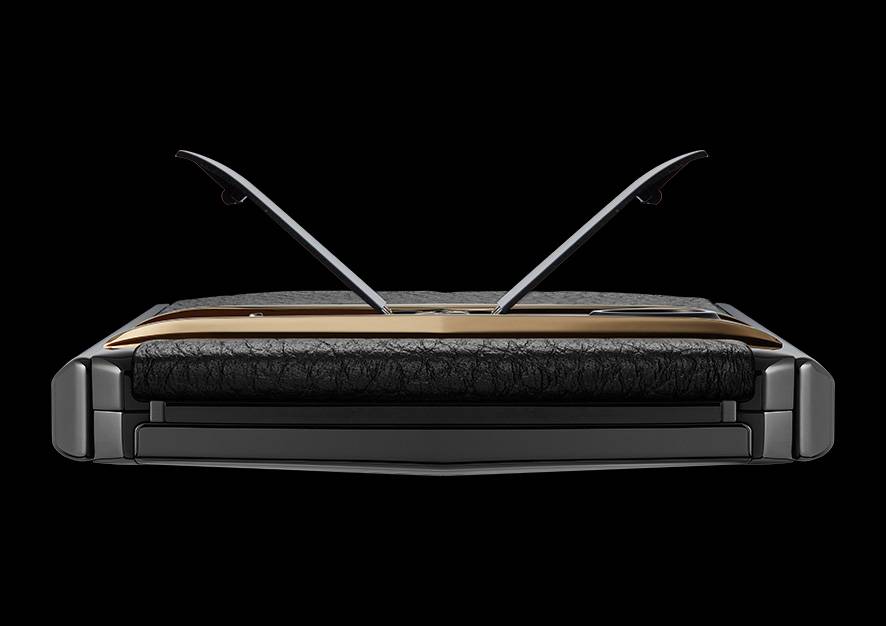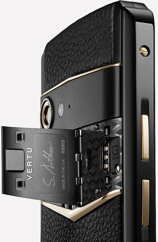 ASTERP哥特系列的SIM卡盖板设计灵感来源于经典跑车的鸥翼门,采用钛合金材质,经过150道工序手工打磨,打开时呈现张开双翼的形状,非常漂亮。SIM卡盖板内部还有精美的镭雕花纹,背部印有工匠的名字,体现了VERTU手机的奢华和工匠精神。